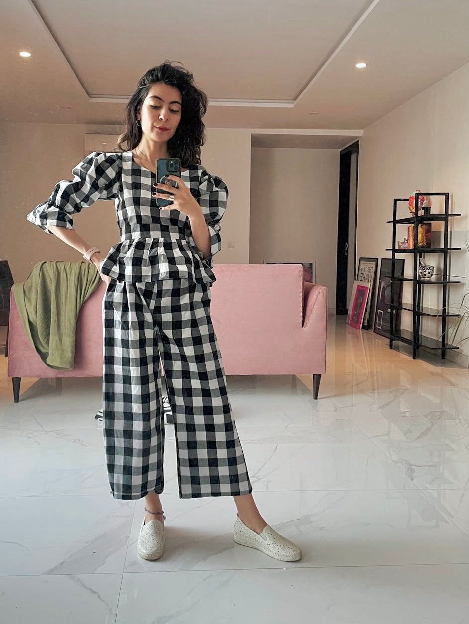 A puffy sleeve corset style top featuring a gingham print, ruched bust detail and back zip. A trendy Black Check gives a casual look to the top with adjustable tie strap. A light weight fabric with floating frill.