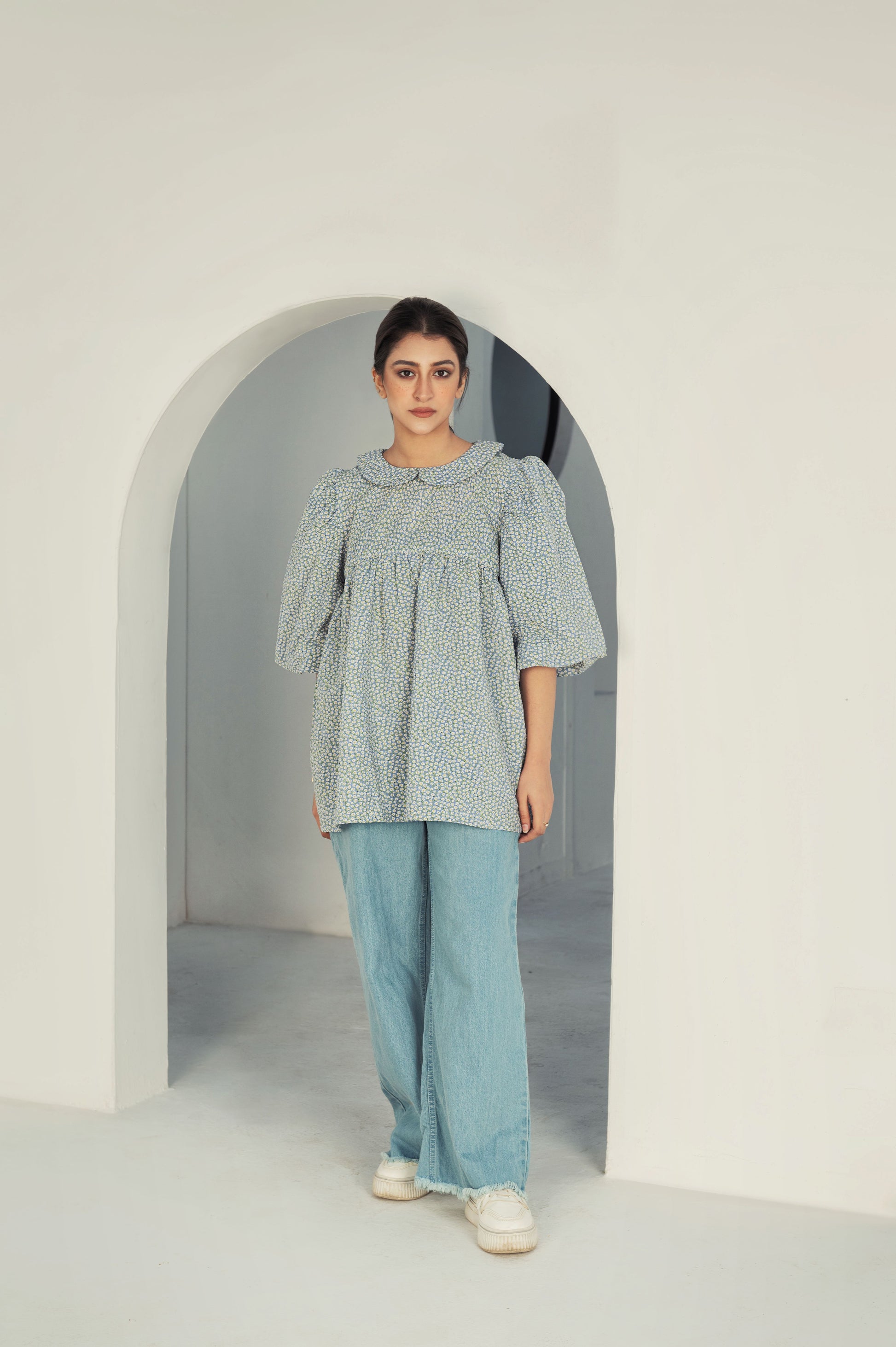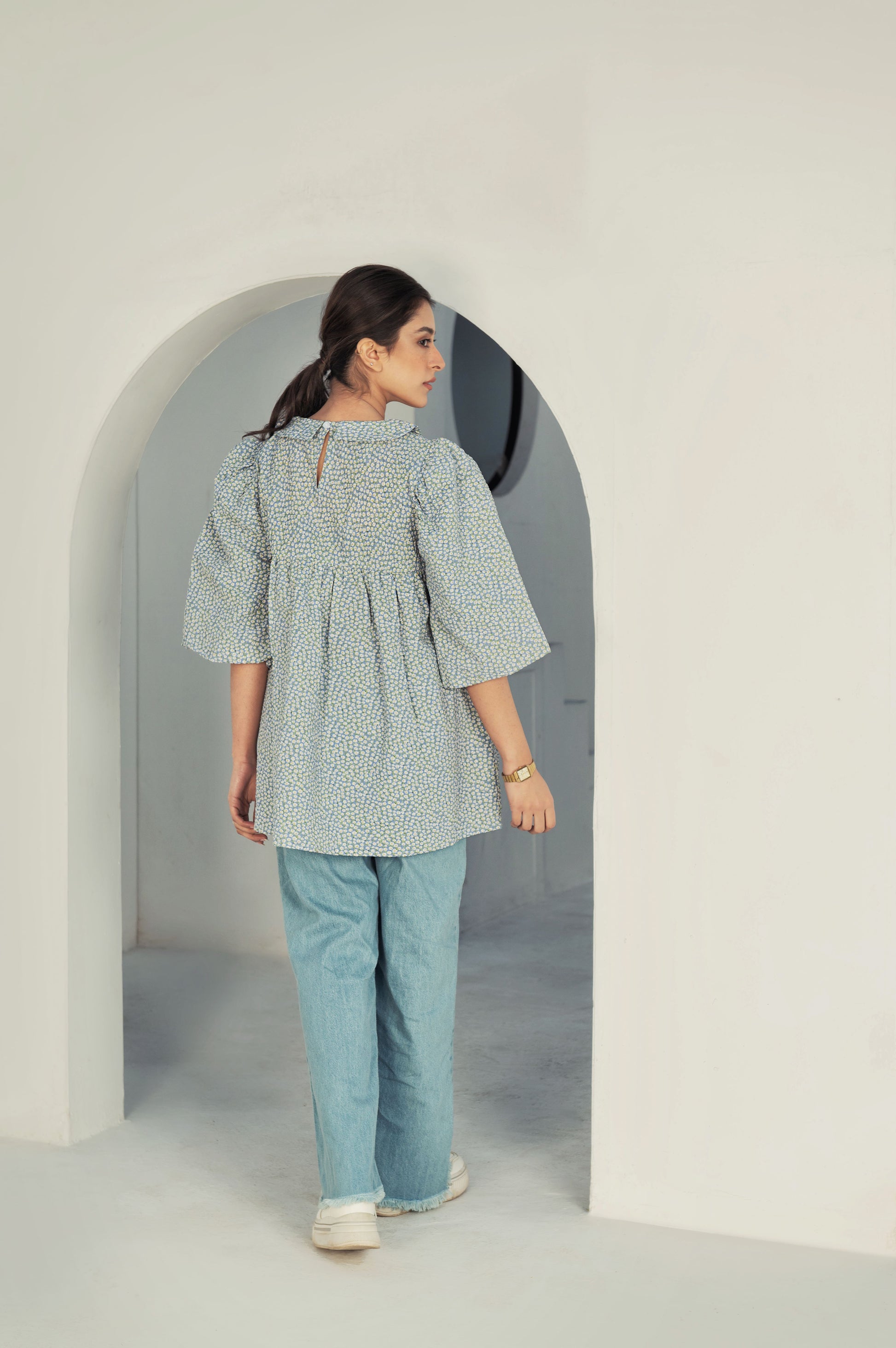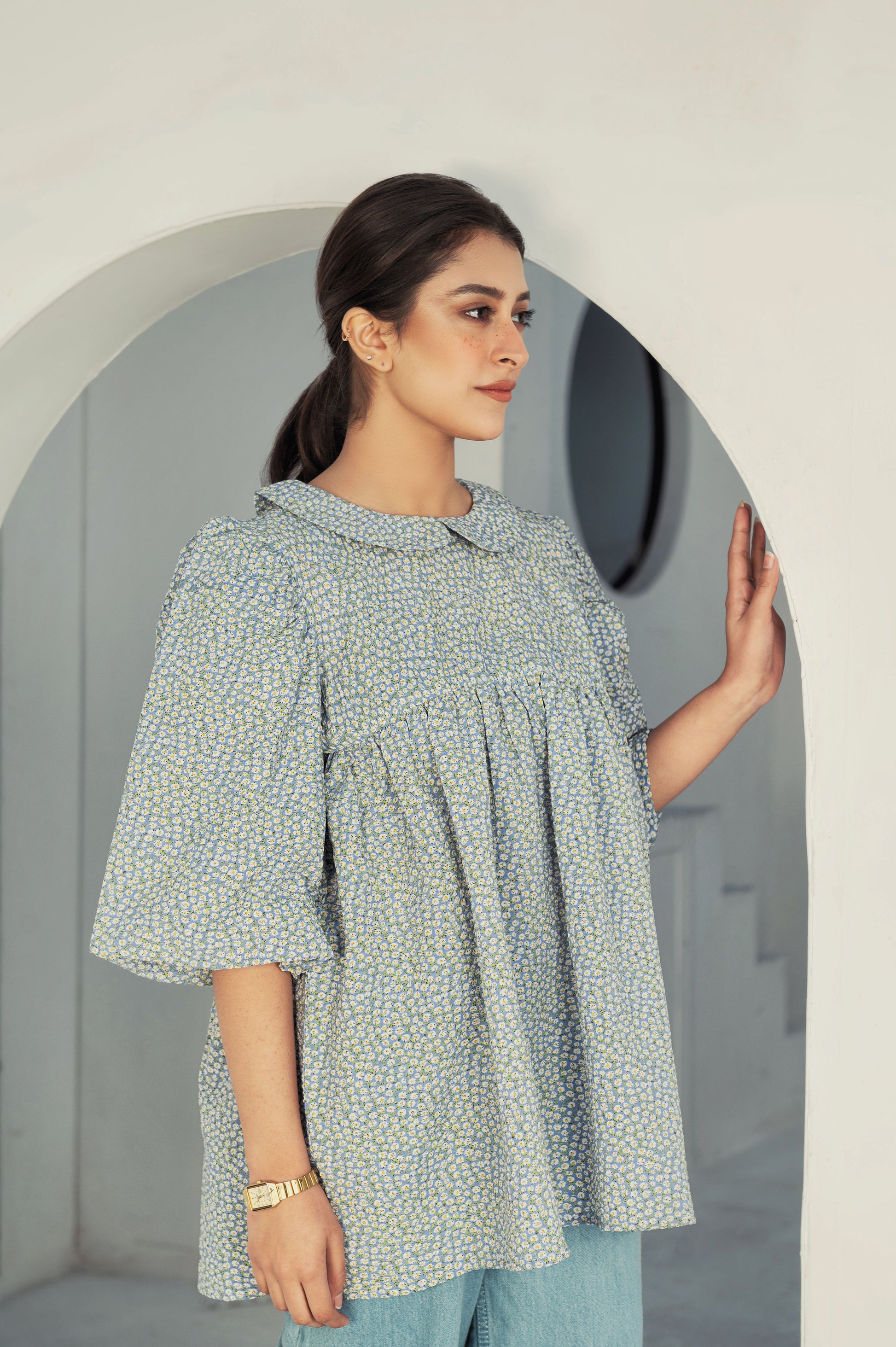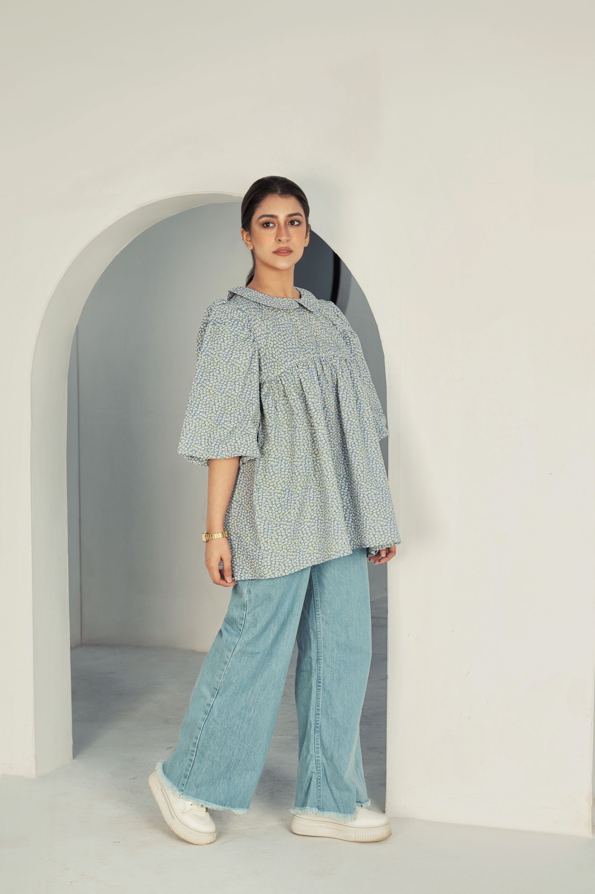Elevate your style with Sky Garden, the perfect combination of crushed cotton fabric and a relaxed, wide-cut blouse. Stay comfortable with a round neckline and stand-up collar, as well as gathered, wide sleeves that add a touch of elegance. The wide hem completes the look with a tailored finish.