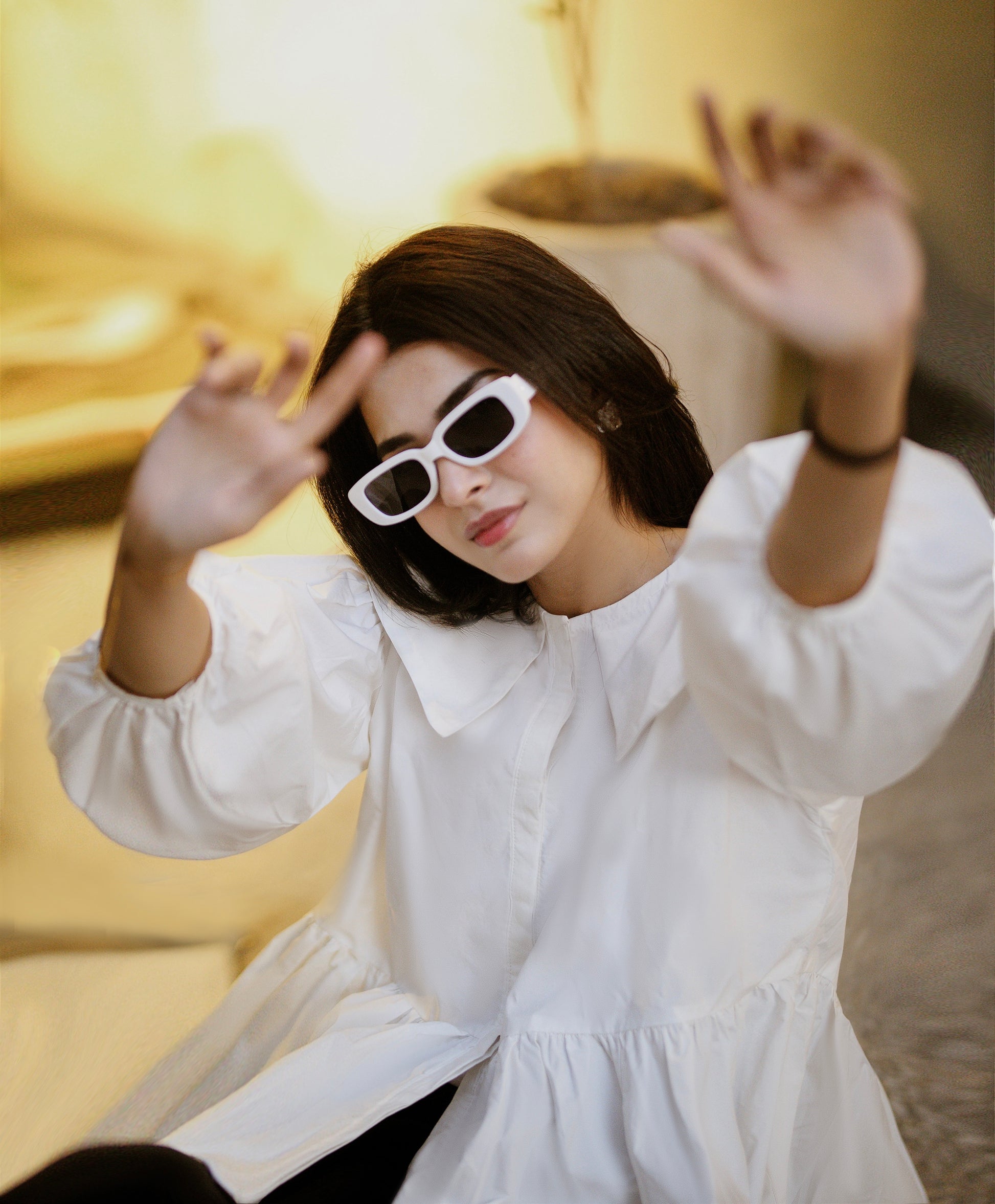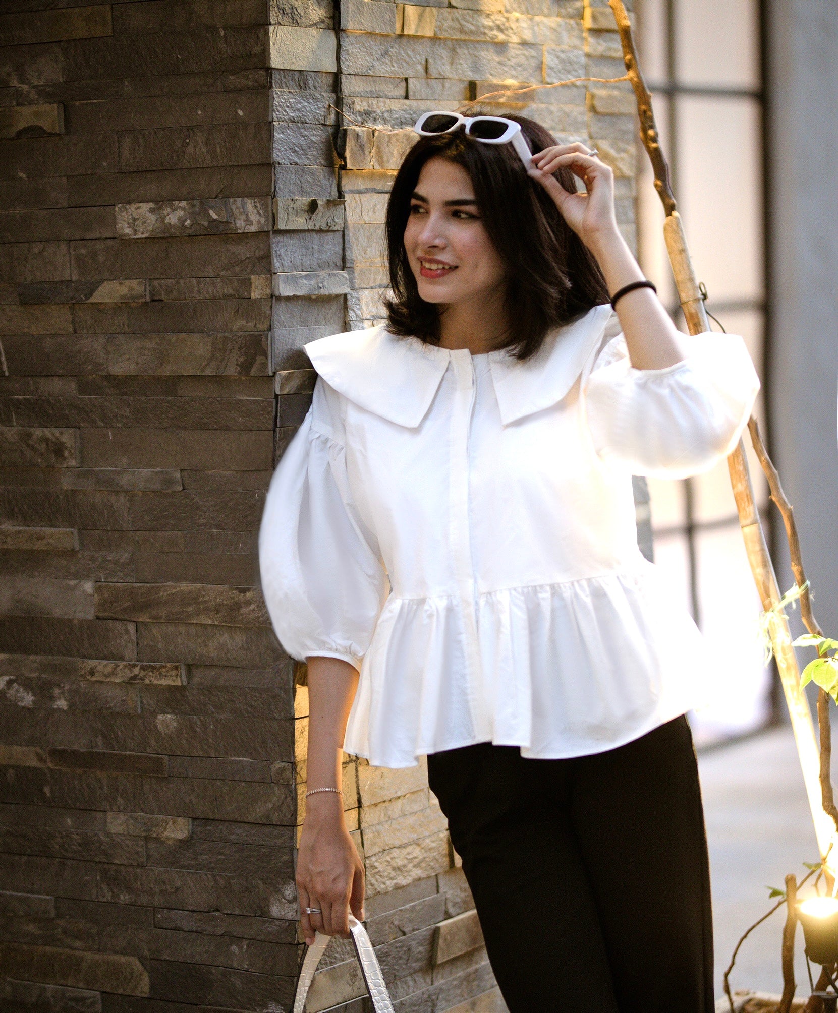 Add spark to your wardrobe this summer, with the Tiana Top. This playful short-length style features with mighty collar to compliment sweetly puffed sleeves and a flattering back bib.