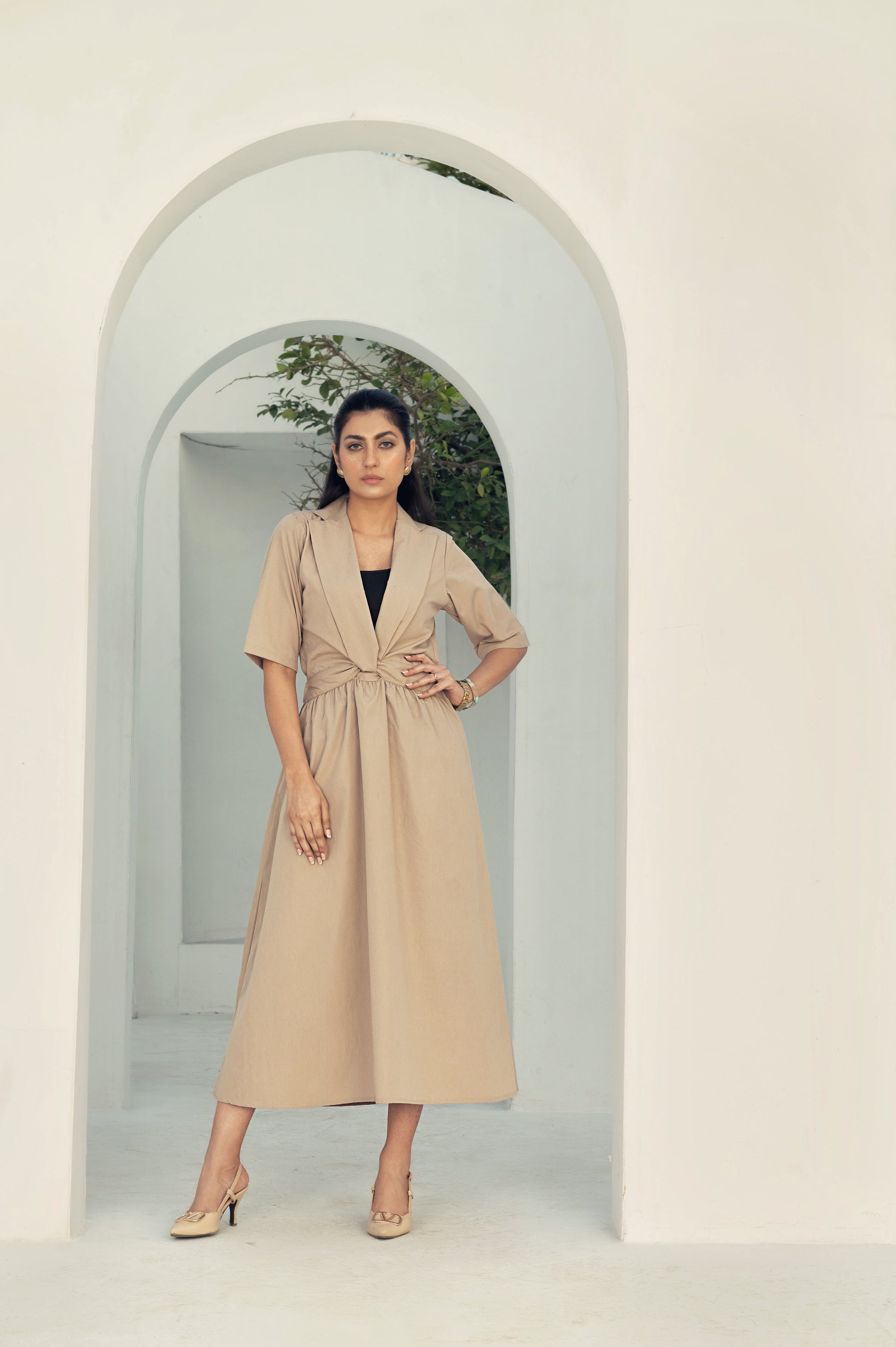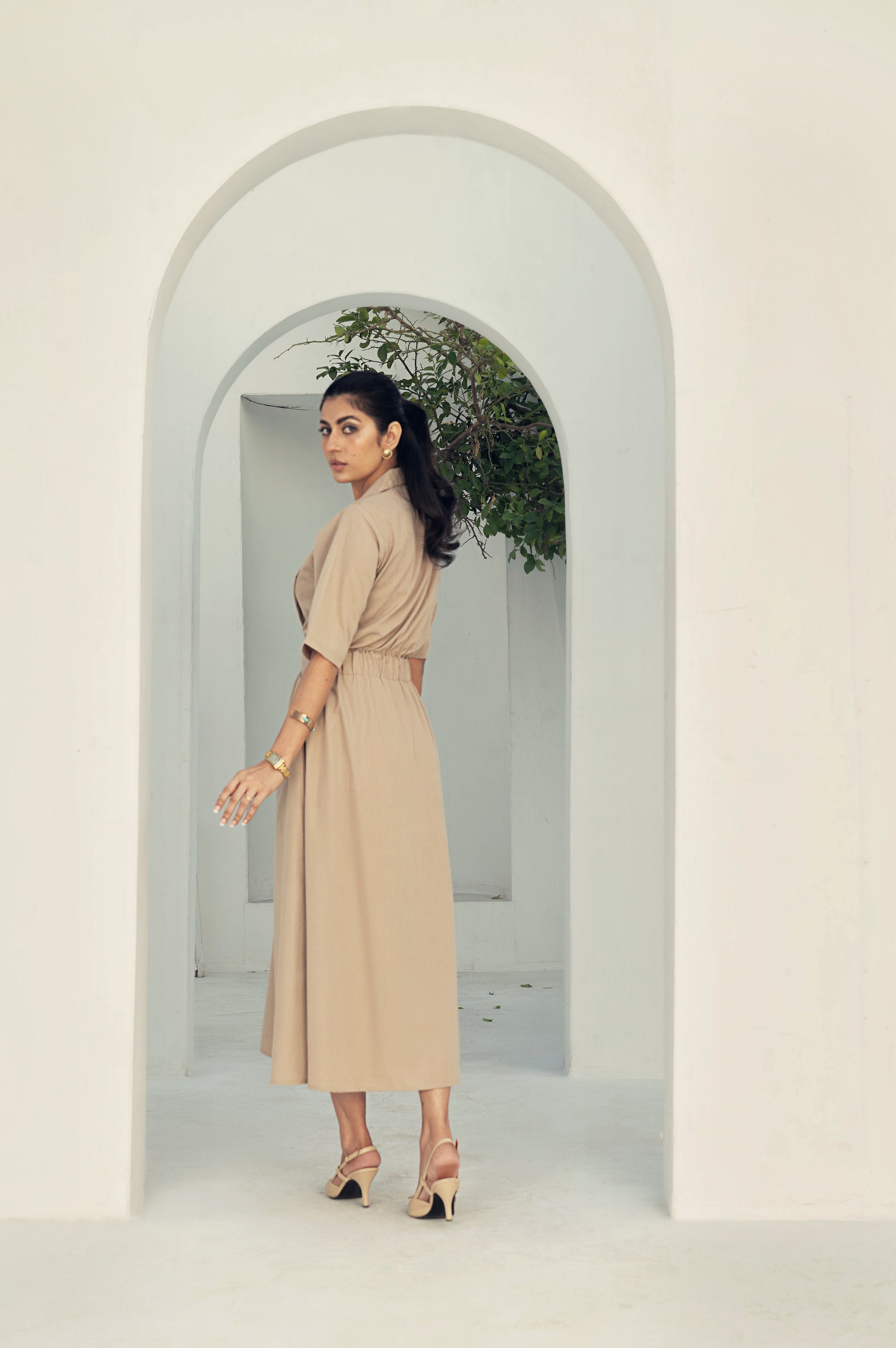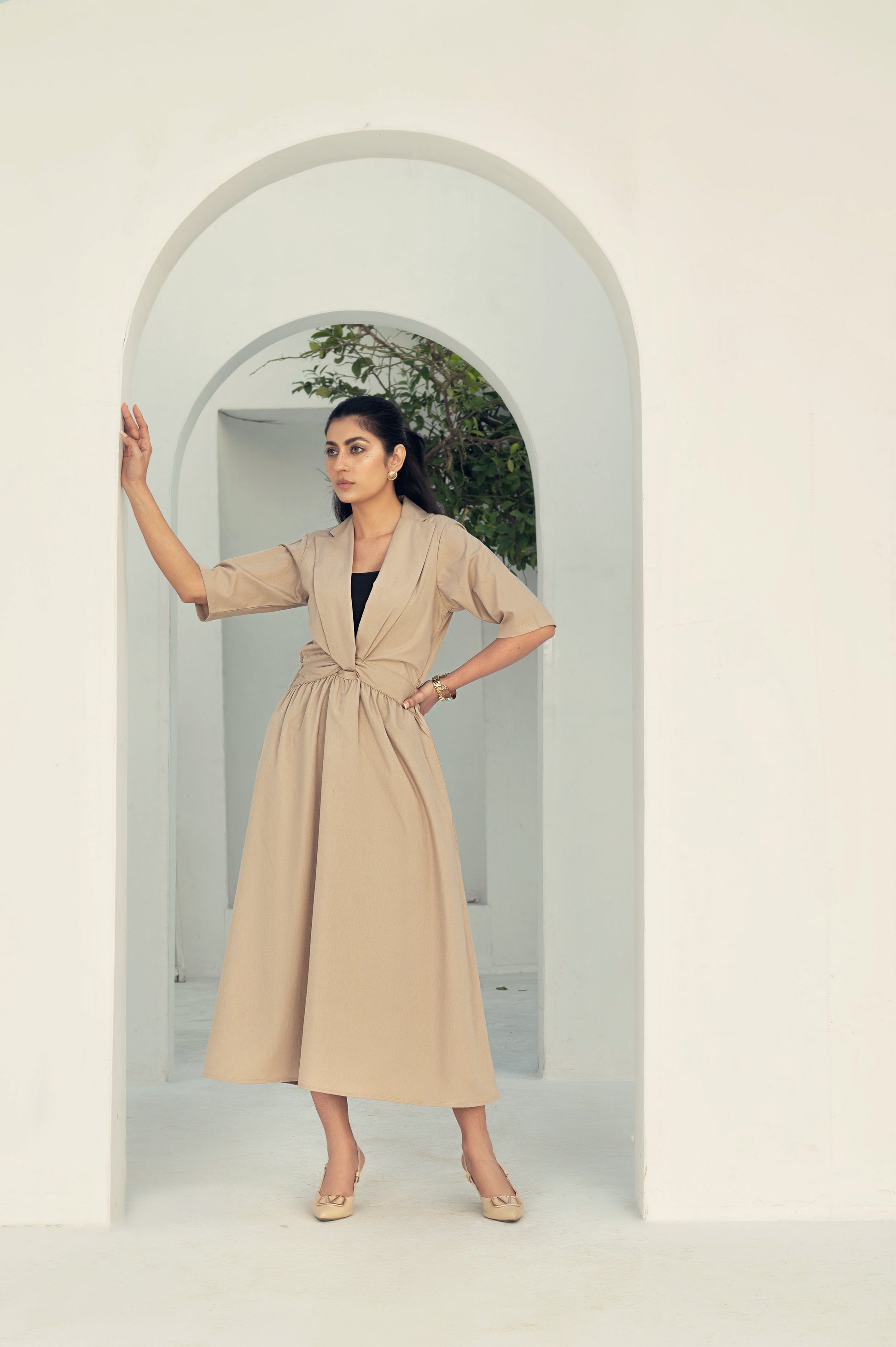 Expertly crafted from a premium irish cotton fabric, the Vine Midii Dress exudes relaxed and airy vibes with its cocoon shape and twisted wrap front. Its classic coat collar and v neckline add a touch of sophistication. Perfect for creating unforgettable memories in the springtime, this dress is a must-have in your wardrobe.